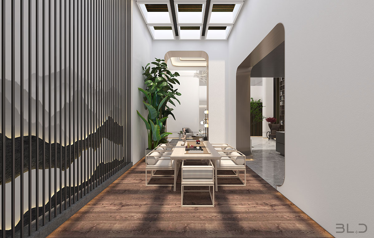 天窗茶室與客廳相連,此處運(yùn)用東方元素,立面采用格柵山水裝飾和圓形窗格造型,恬淡雅致、氣韻生動,于素簡中透出東方禪意。客廳、酒吧、茶室與此共享獨(dú)成風(fēng)格,又融洽貫通,集功能、美觀,實用于一體。